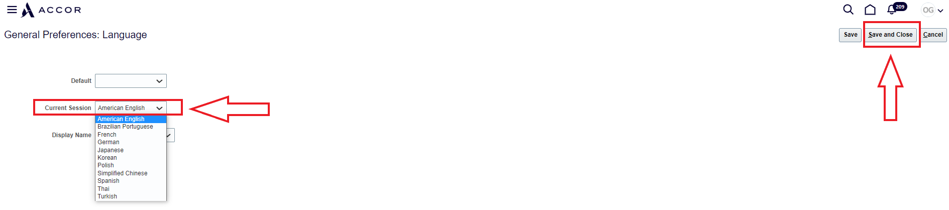 Select your Language from current Session drop-down >>> Click on Save and Close.