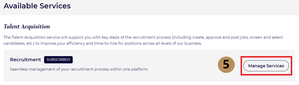 5) After that go to the "Available Services" section to see which services your hotel has. Next to Recruitment click on "Manage services" in order to manage Hiring Manager rule for your hotel/entity.