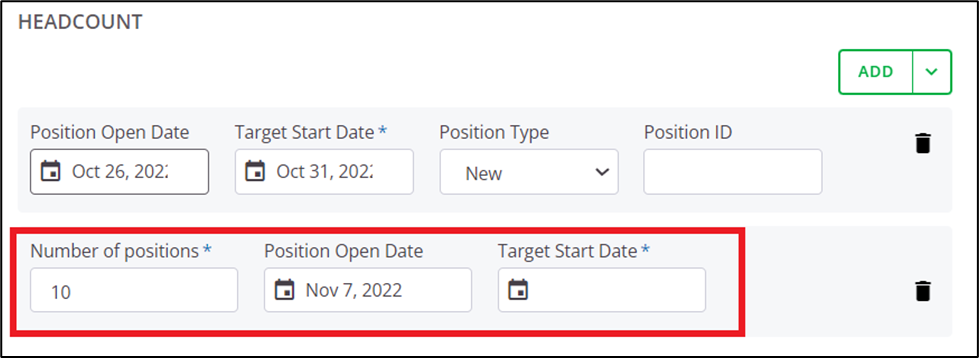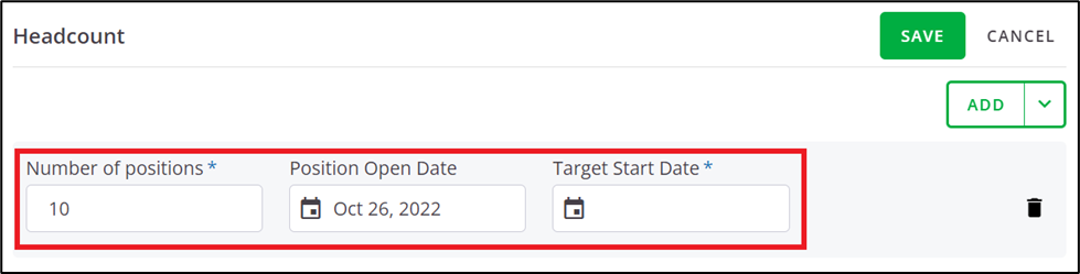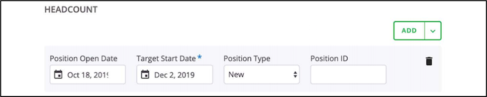 The Headcount section of the Hiring Team page defines the number of open positions on the job, the open/start dates for each position, and some metadata about the position itself.