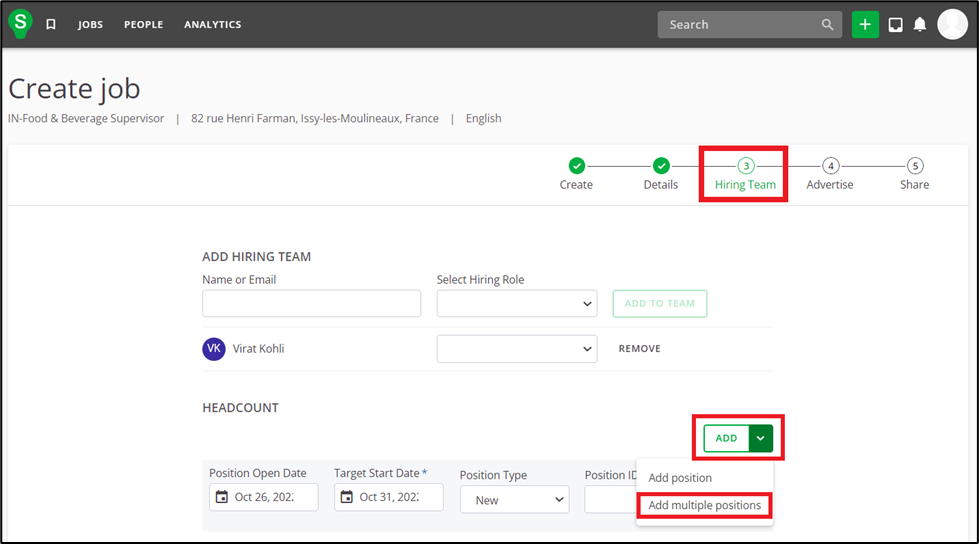 1.4 On the “Hiring Team” step, you can add multiple positions.