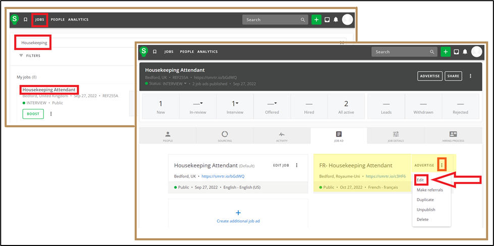 Click on Jobs >> Search Job >> Open jobs by clicking on job name hyperlink >> Click on Job Ad tab >> Click on three dot lines on the Job Ad >> Click on Edit
