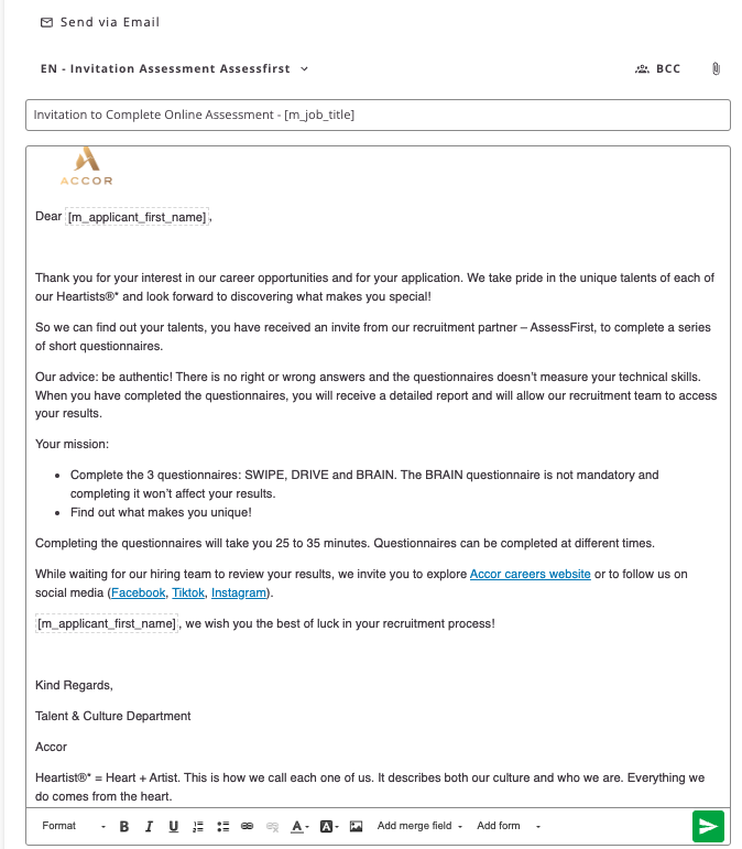 In addition, you can manually choose the EN - Invitation Assessment Assessfirst email template available to notify the candidate when their assessment has been generated.