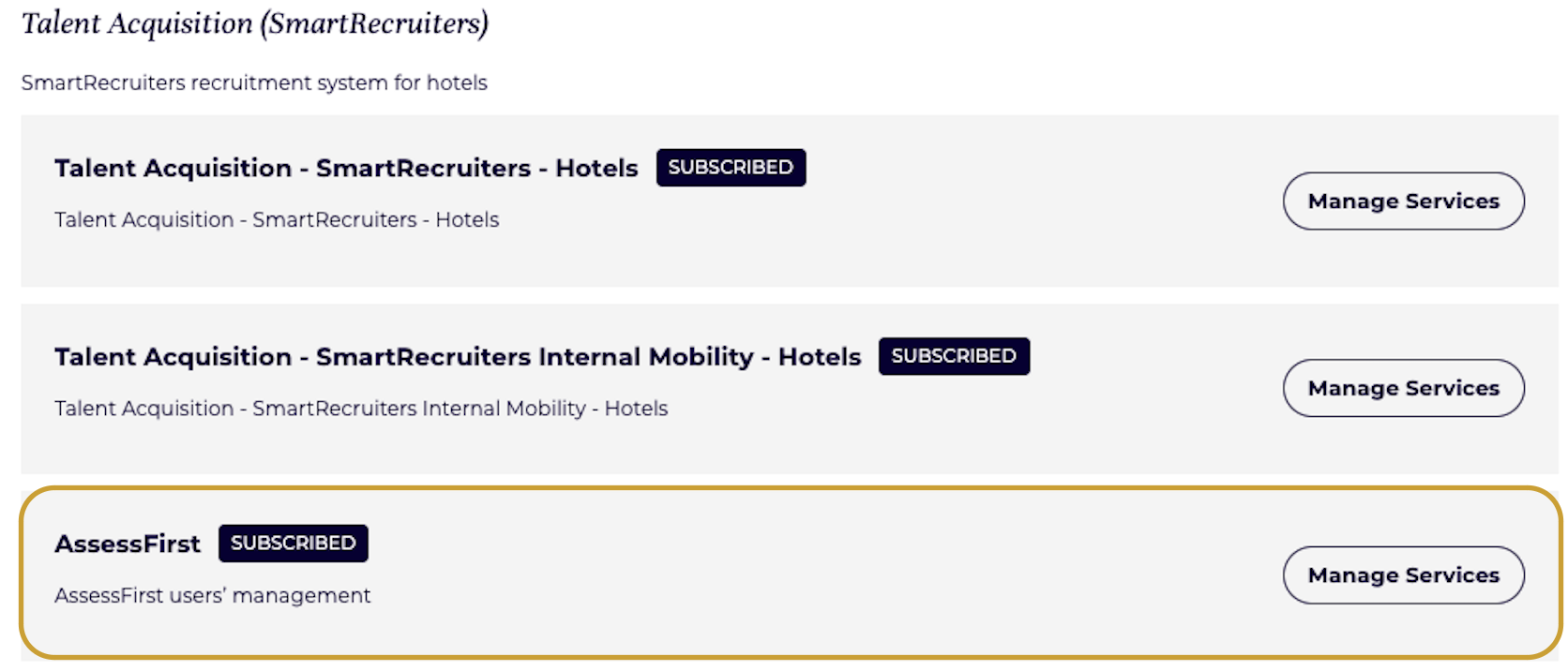 2/ In the Talent Acquisitions (SmartRecruiters) section, click on Manage Services on Assessfirst Subscribed.