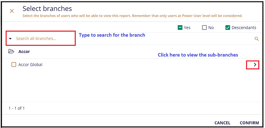 - For Example: If the branch is a region, it may include geographic areas and hotels as sub-branches. You can select these sub-branches as needed. Selecting a branch like "MEA SPAC" will include all super users in the entire region, whereas selecting a specific hotel will include power users under that entity only.